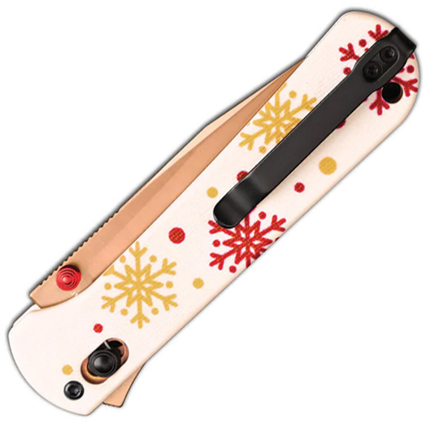 4.25″ (10.8cm) closed. 3.25″ (8.26cm) AR-RPM9 stainless drop point blade. White G10 handle. Thumb stud. Pocket clip. Rose gold finish blade. Snowflake artwork. Boxed.
