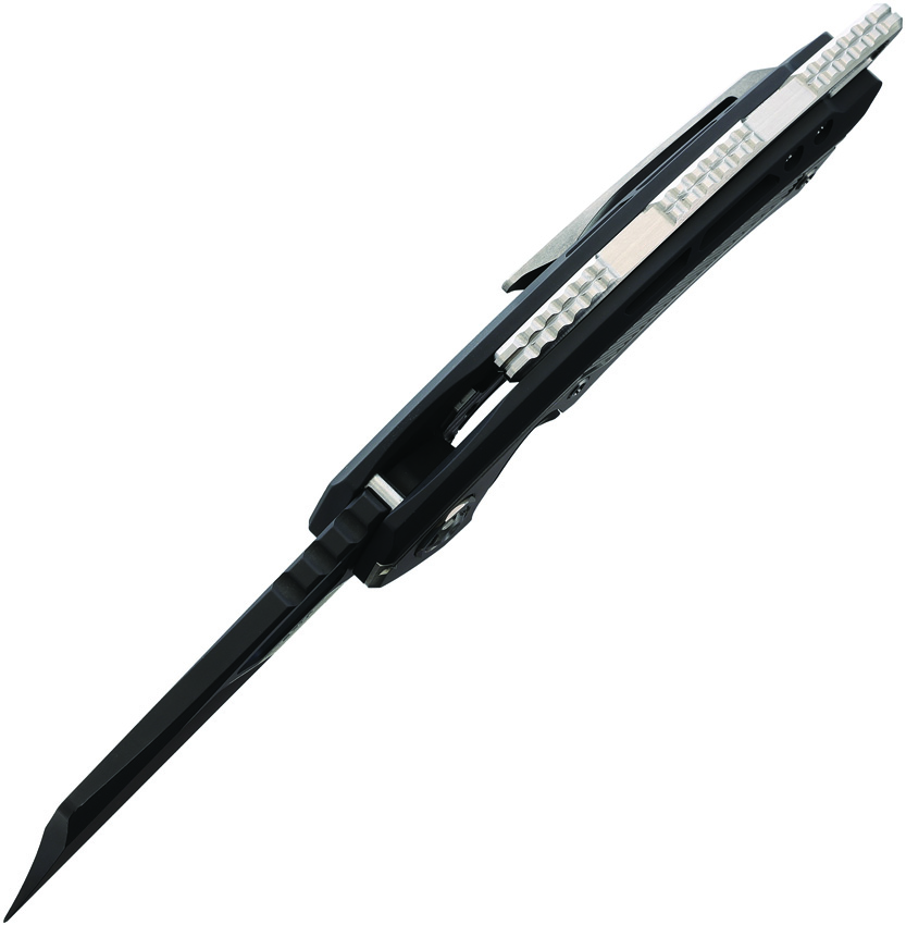 5″ (12.7cm) closed. 3.25″ (8.26cm) black coated CPM S90V stainless blade. Black and silver titanium handle. Thumb pull. Extended tang. Pocket clip. Lanyard hole. Boxed.