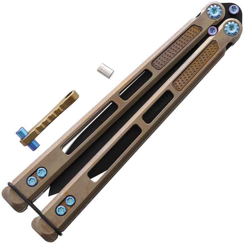 5.75″ (14.61cm) closed. 4.13″ (10.49cm) black coated CPM S30V stainless blade. Bronze stonewash finish titanium handle. Blue anodized accents. Boxed.