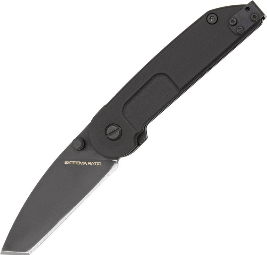 4″ closed linerlock. Black finish N690 stainless cobalt steel tanto blade with dual thumb studs. Black anodized aluminum handles with reversible pocket clip.