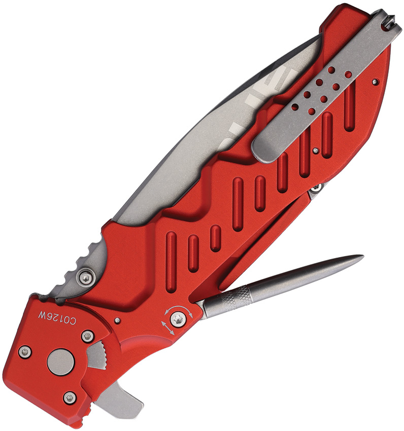 6.13″ (15.57cm) closed. 4.5″ (11.43cm) stonewash finish partially serrated Bohler N690 stainless drop point blade. Red anodized aluminum handle. Glass breaker. Extended tang. Thumb stud. Pocket clip. Marlin spike. Belt/cord cutter. Blade etching. Boxed.