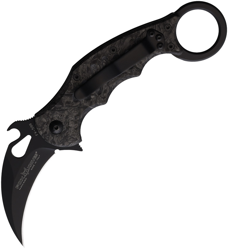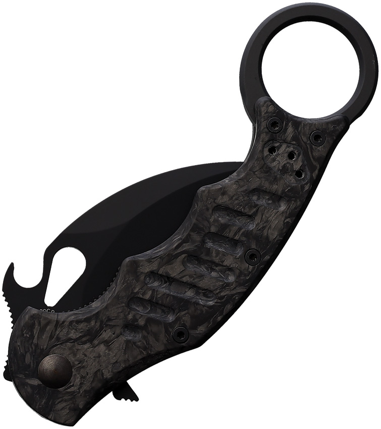 4.75″ (12.07cm) closed. 2.5″ (6.35cm) black coated Bohler N690 stainless karambit blade. Fat finger grooved carbon fiber handle. Finger ring. Pocket clip. Extended tang. Thumb pull. Boxed.