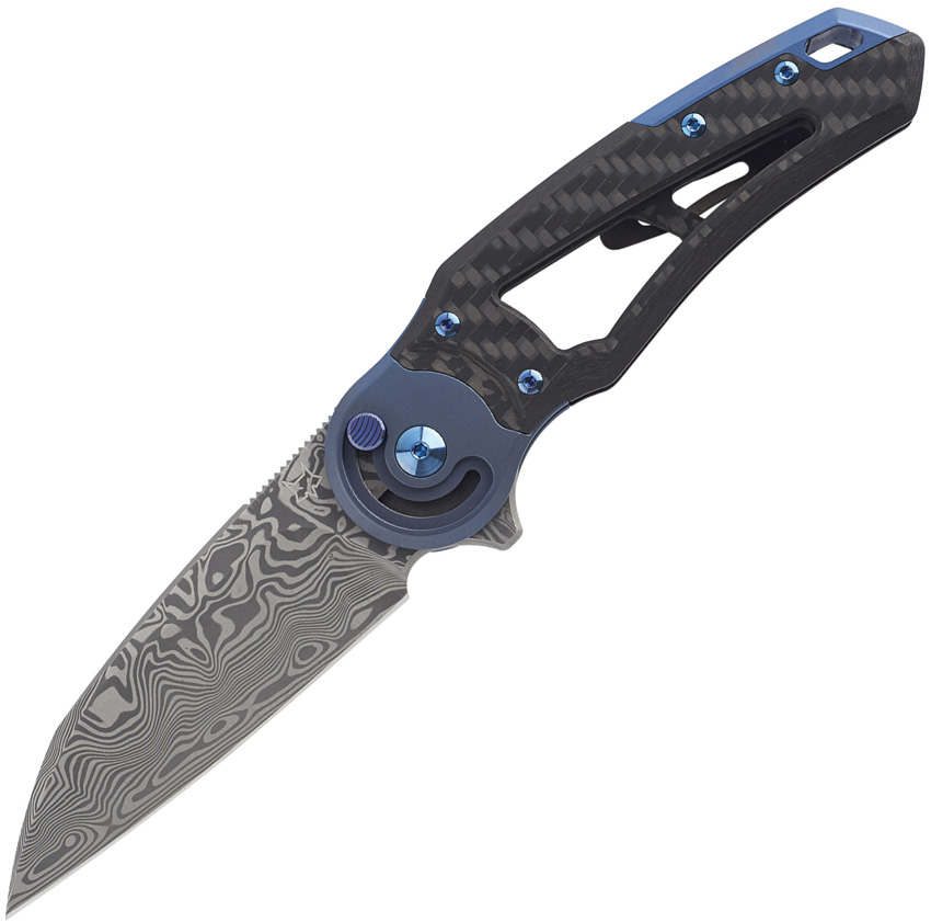 4.75″ (12.07cm) closed. 3.13″ (7.95cm) Damascus steel blade. Carbon fiber handle. Extended tang. Lanyard hole. Pocket clip. Blue anodized accents. Boxed.