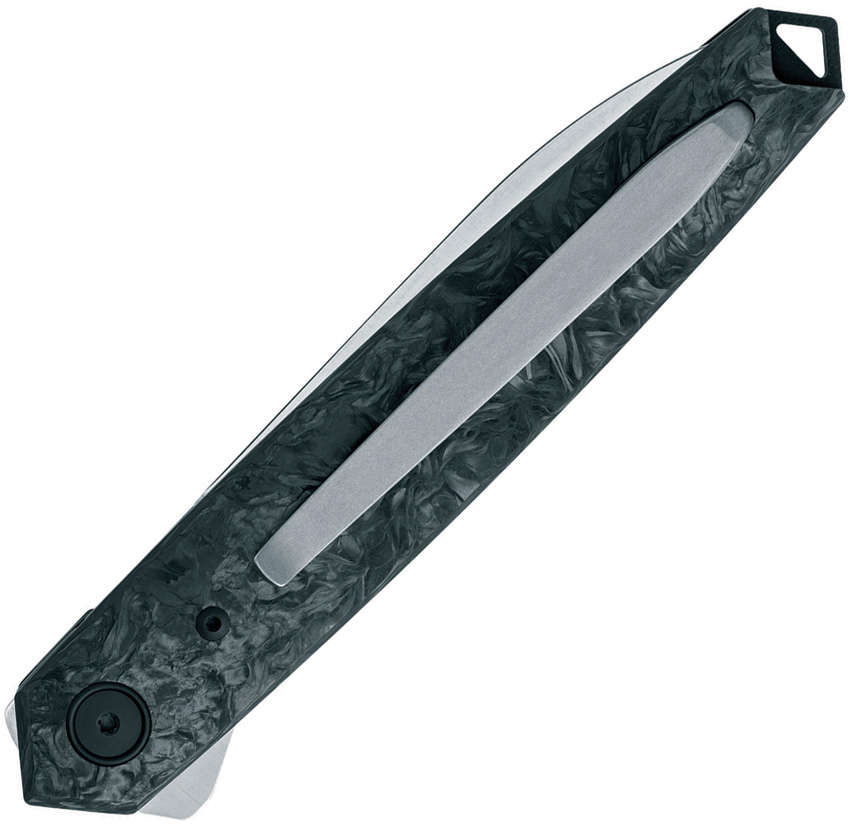 5.25″ (13.34cm) closed. 3.75″ (9.53cm) satin finish MagnaCut steel blade. Dark Matter carbon fiber handle. Extended tang. Lanyard hole. Pocket clip. Black nylon zippered storage case. Designed by Bob Terzuola. Boxed.