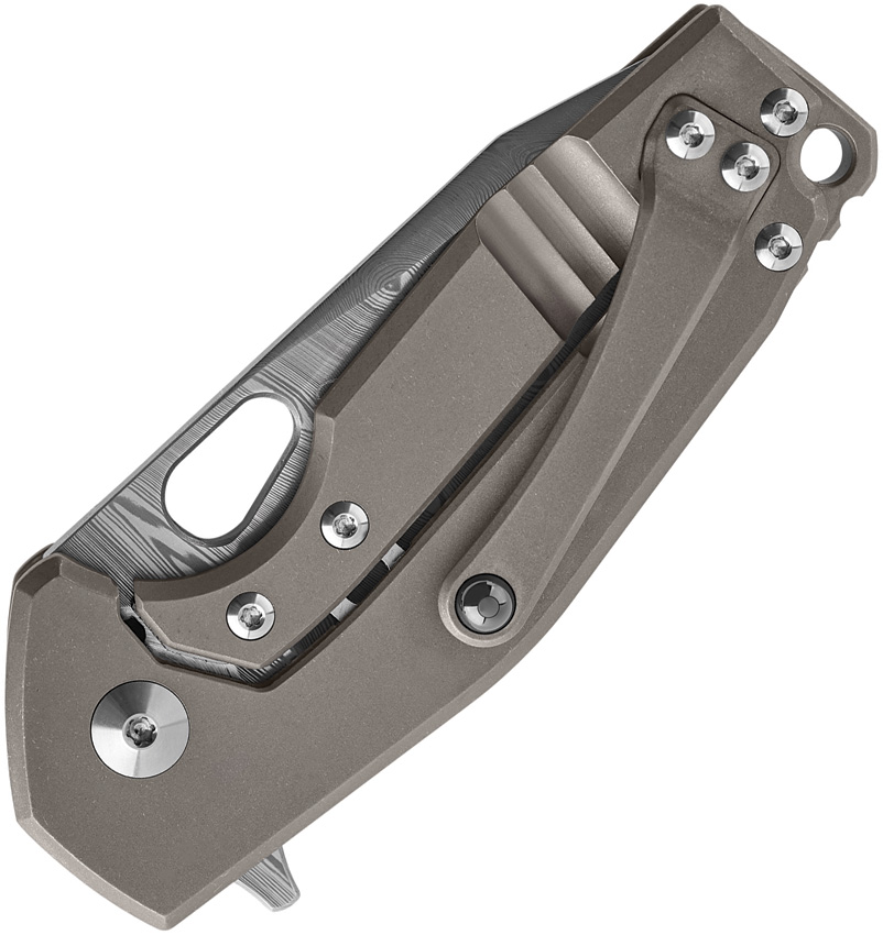 3.5″ (8.89cm) closed. 2.38″ (6.05cm) Damascus steel blade. Stonewash finish titanium handle. Extended tang. Lanyard hole. Pocket clip. Thumb pull. Designed by Jesper Voxnaes. Boxed.