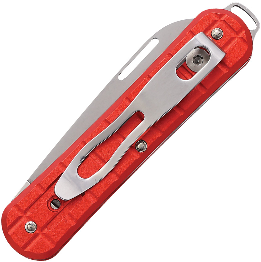 3.13″ (7.95cm) closed. 2.13″ (5.41cm) polished Bohler N690 stainless blade. Red grenade pattern aluminum handle. Lanyard hole. Thumb pull. Pocket clip. Boxed.
