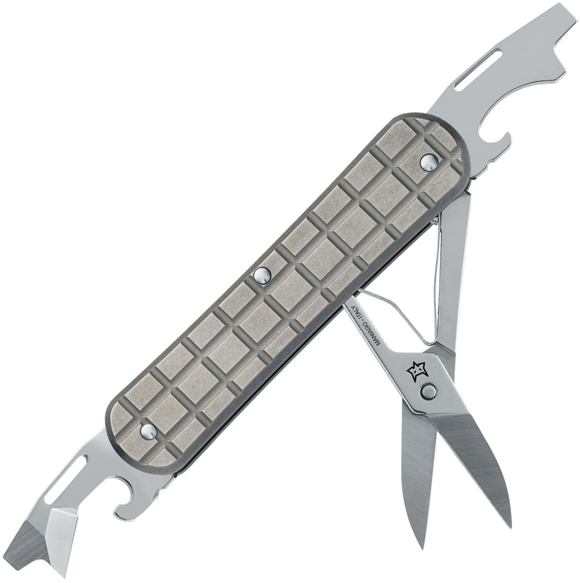 2.88″ (7.32cm) closed. Gray grenade pattern titanium handle. Tools include: Scissors l Bottle opener l Can opener l Flat head screwdriver l Screwdriver tip l Small blade. Boxed.