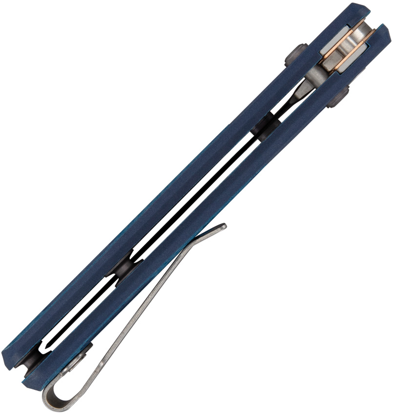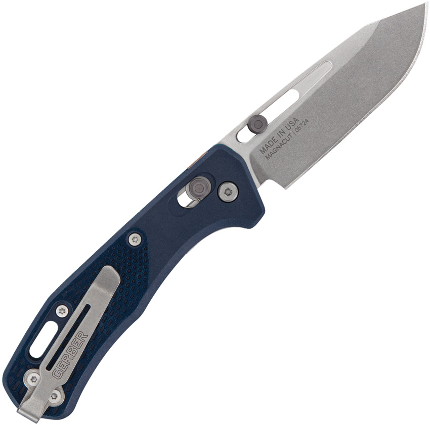 4″ (10.16cm) closed. 3″ (7.62cm) stonewash finish magnaCut steel blade. Urban blue GFN handle. Pocket clip. Lanyard hole. Thumb stud. Boxed with hanging tab.