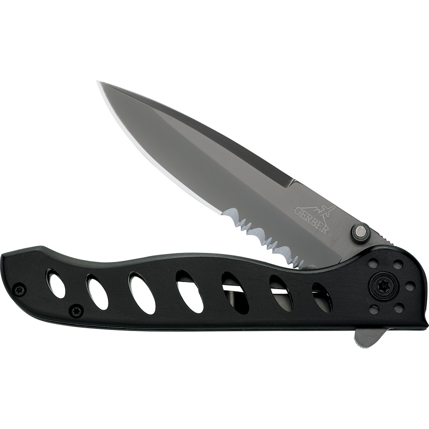 4.63″ (11.76cm) closed. 3″ (7.62cm) gray TiNi coated partially serrated 7Cr17MoV stainless blade. Black aluminum handle. Thumb stud. Extended tang. Pocket clip. Clam packed.