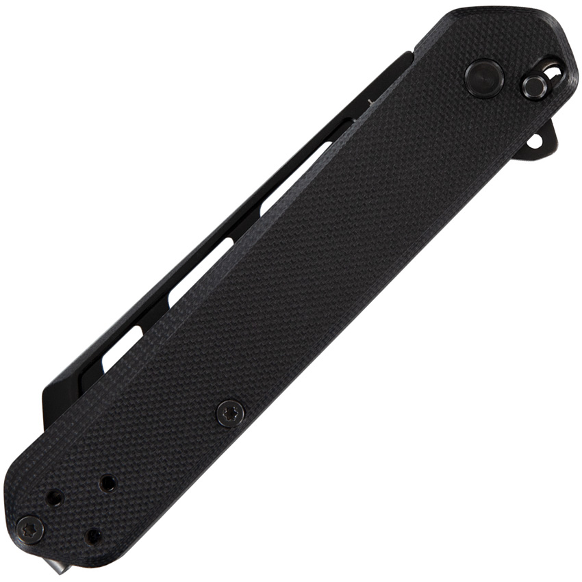 Assisted opening. 4″ (10.16cm) closed. 3″ (7.62cm) black finish D2 tool steel reverse tanto blade. Black G10 handle. Extended tang. Pocket clip. Safety switch. PVD coated barrel spacers. Boxed.