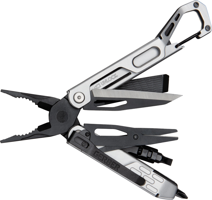 4.63″ closed. 6.3″ overall. Tools include: Bottle opener l Pocket clip l Carabiner l Pliers l Needlenose pliers l Large blade l Scissors l Wire cutter l File. Linerlock. Butterfly opening. Flip bit driver I Chisel I Extra bit storage. Boxed.