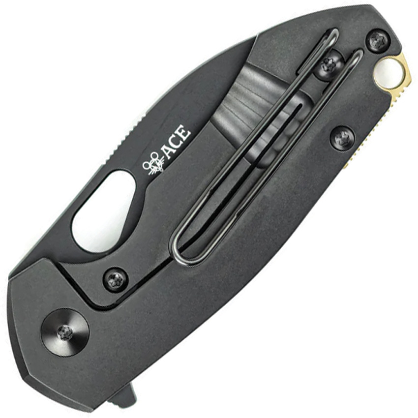 3.38″ (8.59cm) closed. 2.38″ (6.05cm) black PVD coated Bohler M390 stainless drop point blade. Black PVD coated titanium handle. Thumb pull. Extended tang. Lanyard hole. Pocket clip. Boxed.