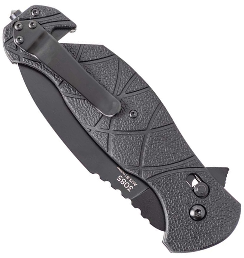 5.25″ (13.34cm) closed. 3.5″ (8.89cm) black finish AUS-8 stainless drop point blade. Black GFN handle. Belt/cord cutter. Glass breaker. Thumb stud. Pocket clip. Extended tang. Boxed with hanging tab.