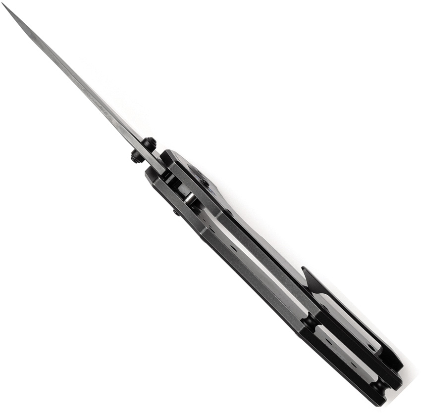 4.25″ (10.8cm) closed. 3.13″ (7.95cm) CPM S35VN stainless drop point blade. Black stonewash finish titanium handle with Timascus inlay. Thumb stud. Pocket clip. Mirror DLC coated blade. Black nylon zippered storage case. Boxed.