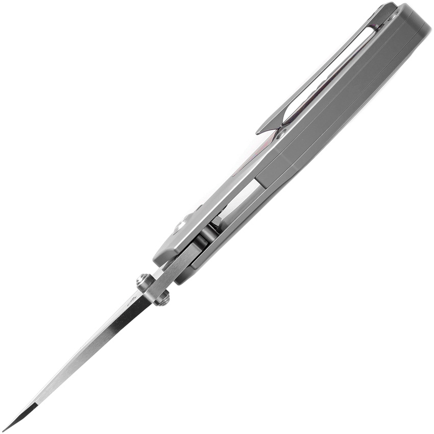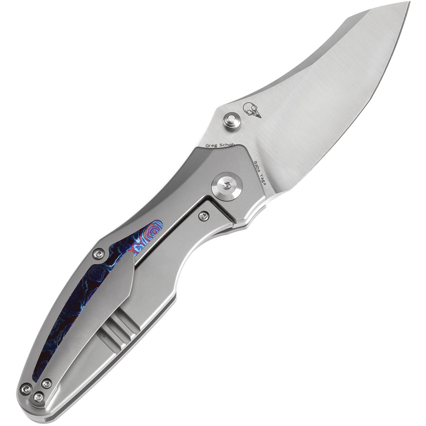 4.38″ (11.13cm) closed. 3.13″ (7.95cm) satin finish CPM-20CV stainless Wharncliffe blade. Bead blast finish titanium handle with Timascus inlay. Thumb stud. Pocket clip. Black nylon pouch. Boxed.