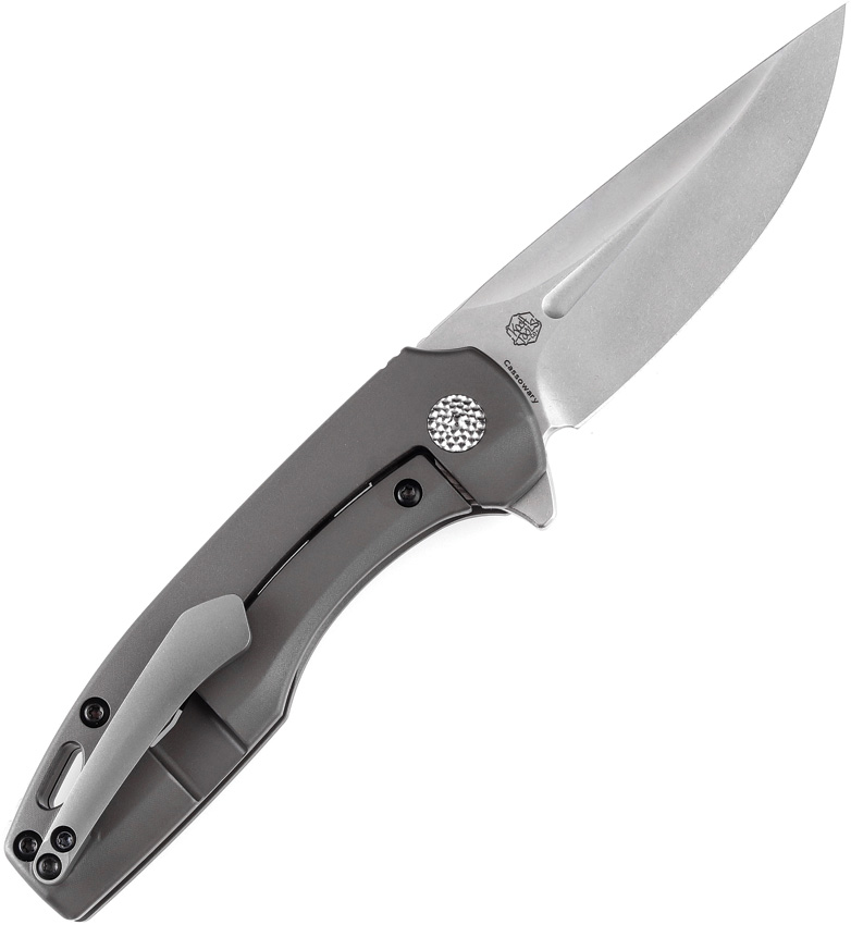 4″ (10.16cm) closed. 3″ (7.62cm) stonewash finish CPM S35VN stainless blade. Gray titanium handle. Extended tang. Lanyard hole. Pocket clip. Black nylon pouch. Boxed.