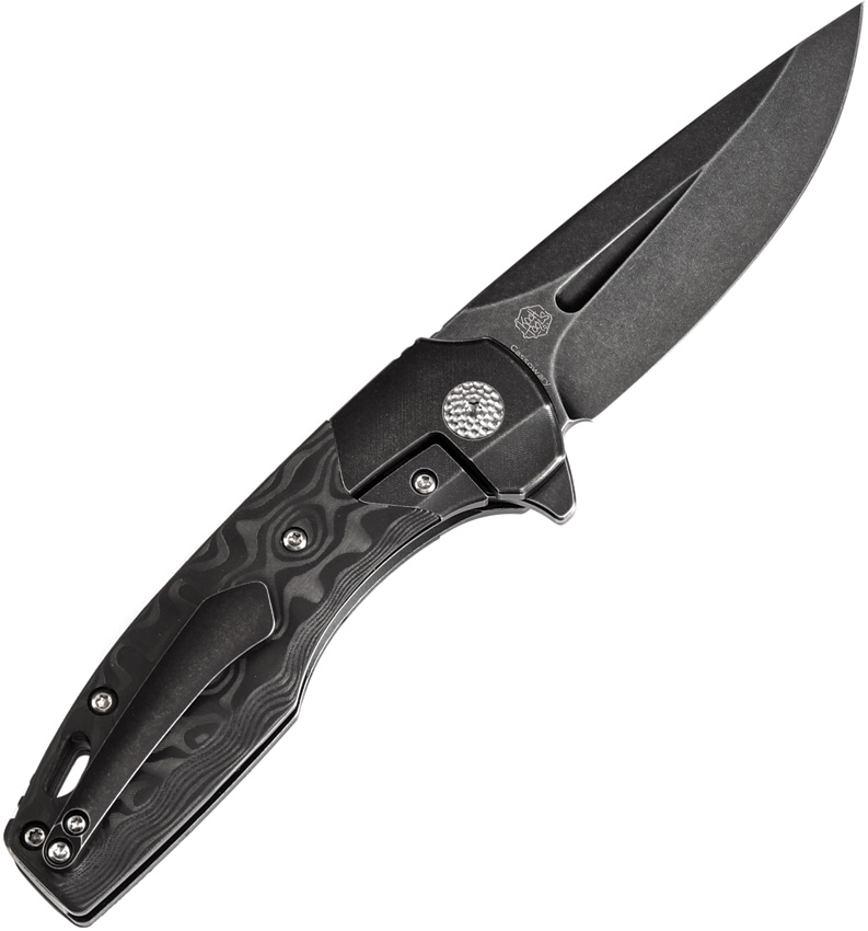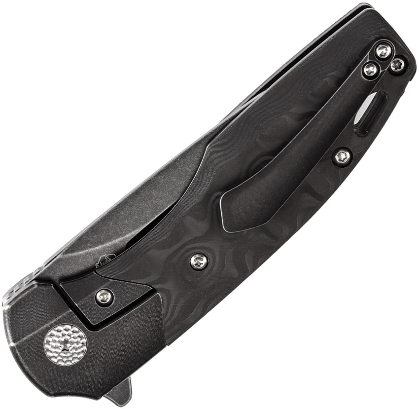 4″ (10.16cm) closed. 3″ (7.62cm) black stonewash finish CPM S35VN stainless blade. Black stonewash finish titanium handle with Black rose pattern carbon fiber inlay. Extended tang. Lanyard hole. Pocket clip. Black nylon pouch. Boxed.