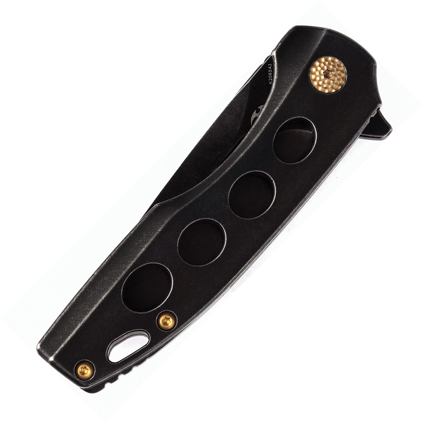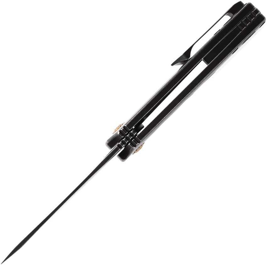 4″ (10.16cm) closed. 3″ (7.62cm) black stonewash finish CPM S35VN stainless blade. Black TiNi finish titanium handle with Nebula carbon fiber inlay. Extended tang. Lanyard hole. Pocket clip. Black nylon pouch. Boxed.