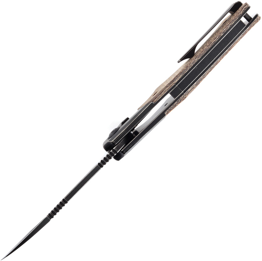 4.5″ (11.43cm) closed. 3.5″ (8.89cm) black stonewash finish CPM-20CV stainless Wharncliffe blade. Black stonewash finish titanium handle with brown micarta onlay. Extended tang. Pocket clip. Black nylon pouch. Boxed.