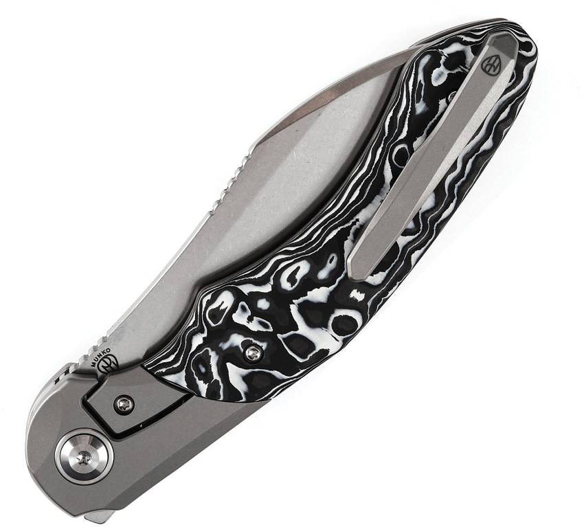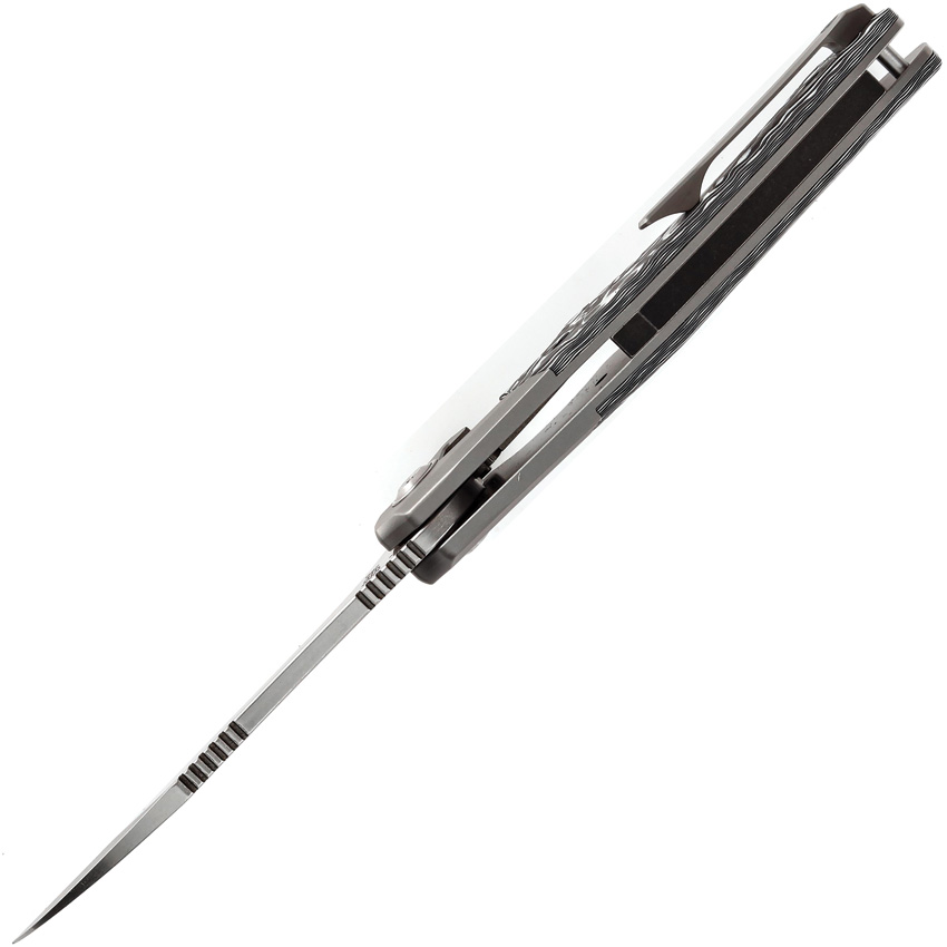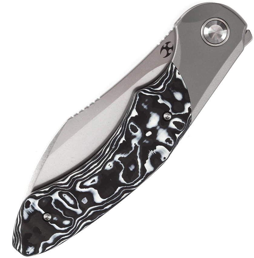 4.5″ (11.43cm) closed. 3.5″ (8.89cm) stonewash finish CPM-20CV stainless Wharncliffe blade. Gray titanium handle with Black and white carbon fiber onlay. Extended tang. Pocket clip. Black nylon pouch. Boxed.