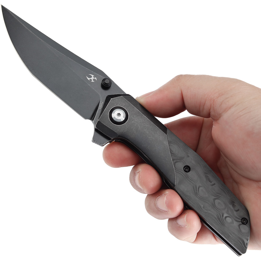 4.75″ (12.07cm) closed. 3.5″ (8.89cm) black stonewash finish CPM S35VN stainless clip point blade. Black stonewash finish titanium handle with Rose pattern carbon fiber inlay. Extended tang. Thumb stud. Pocket clip. Black nylon pouch. Boxed.