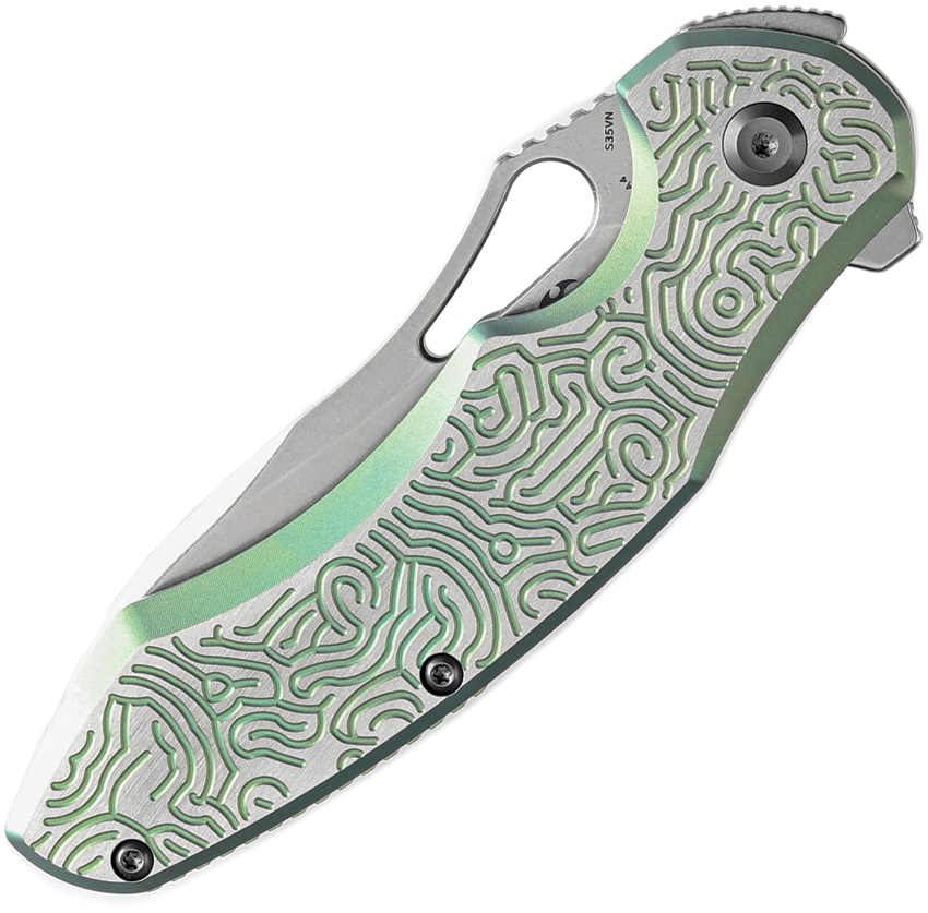 4.5″ (11.43cm) closed. 3.5″ (8.89cm) stonewash finish CPM S35VN stainless drop point blade. Green textured titanium handle. Extended tang. Thumb pull. Pocket clip. Black nylon pouch. Boxed.