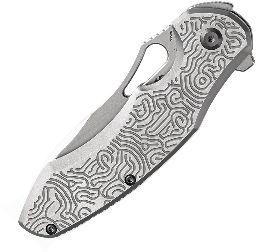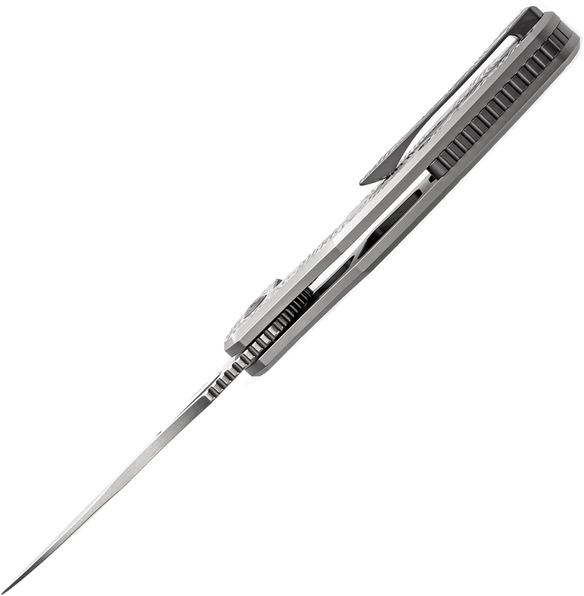 4.5″ (11.43cm) closed. 3.5″ (8.89cm) stonewash finish CPM S35VN stainless drop point blade. Gray textured titanium handle. Extended tang. Thumb pull. Pocket clip. Black nylon pouch. Boxed.