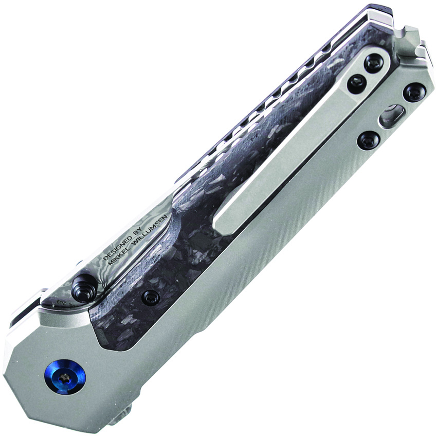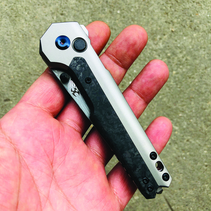 4.25″ (10.8cm) closed. 3.25″ (8.26cm) Damascus steel blade. Gray titanium handle with Shredded carbon fiber inlay. Extended tang. Pocket clip. Lanyard hole. Glass breaker. Thumb stud. Black nylon pouch. Boxed.