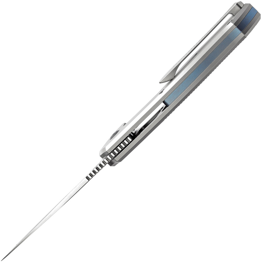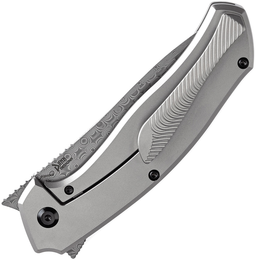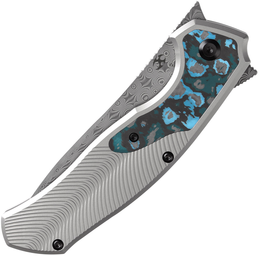 4.75″ (12.07cm) closed. 3.5″ (8.89cm) Damascus steel clip point blade. Gray titanium handle with Arctic Storm Fat carbon fiber inlay. Extended tang. Pocket clip. Black nylon pouch. Boxed.