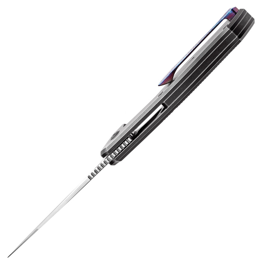 4.75″ (12.07cm) closed. 3.5″ (8.89cm) satin finish CPM S35VN stainless clip point blade. Black stonewash finish titanium handle with Timascus inlay. Extended tang. Timascus pocket clip. Black nylon pouch. Boxed.