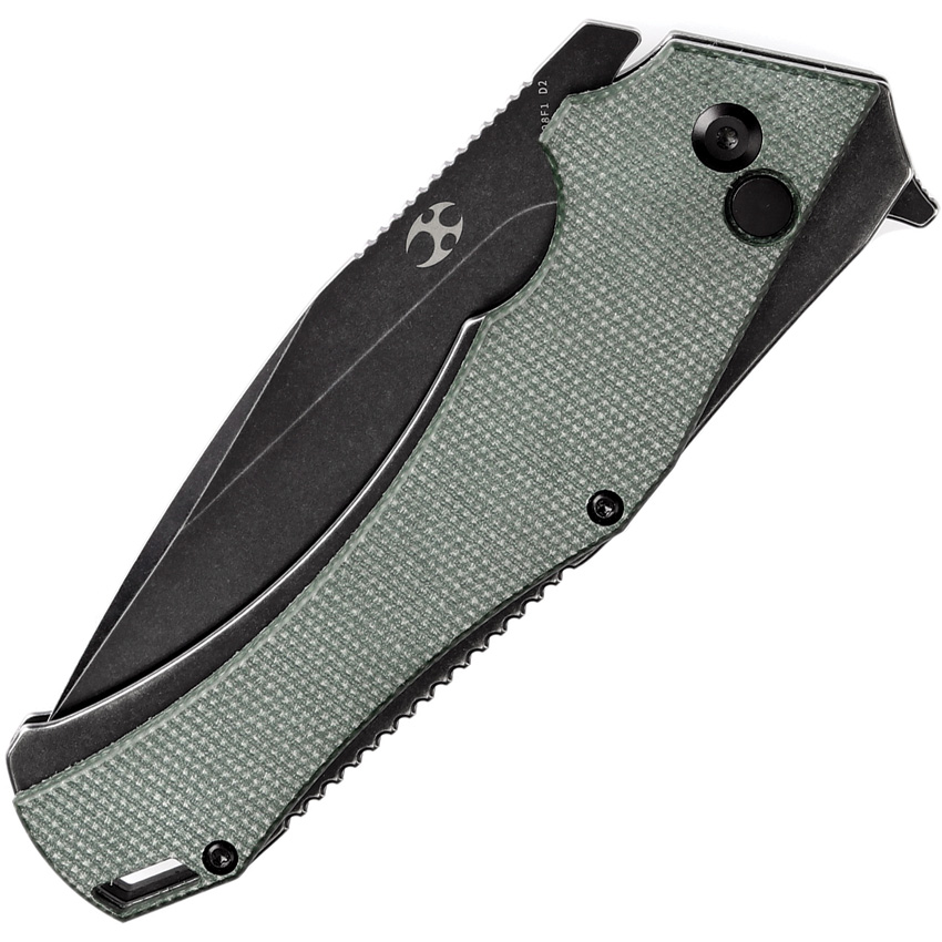 5.25″ (13.34cm) closed. 3.75″ (9.53cm) black stonewash finish D2 tool steel blade. Green canvas micarta handle. Extended tang. Lanyard hole. Pocket clip. Black nylon pouch. Boxed.