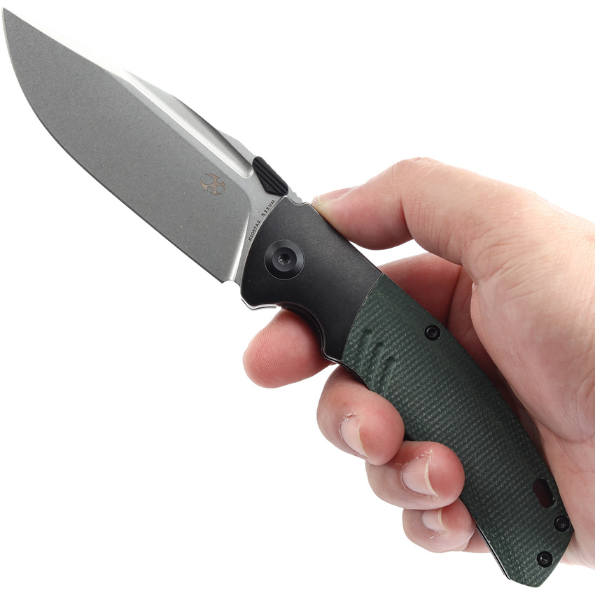 4.63″ (11.76cm) closed. 3.63″ (9.22cm) stonewash finish CPM S35VN stainless clip point blade. Black stonewash finish titanium handle with green micarta inlay. Thumb disk. Lanyard hole. Pocket clip. Black nylon pouch. Boxed.