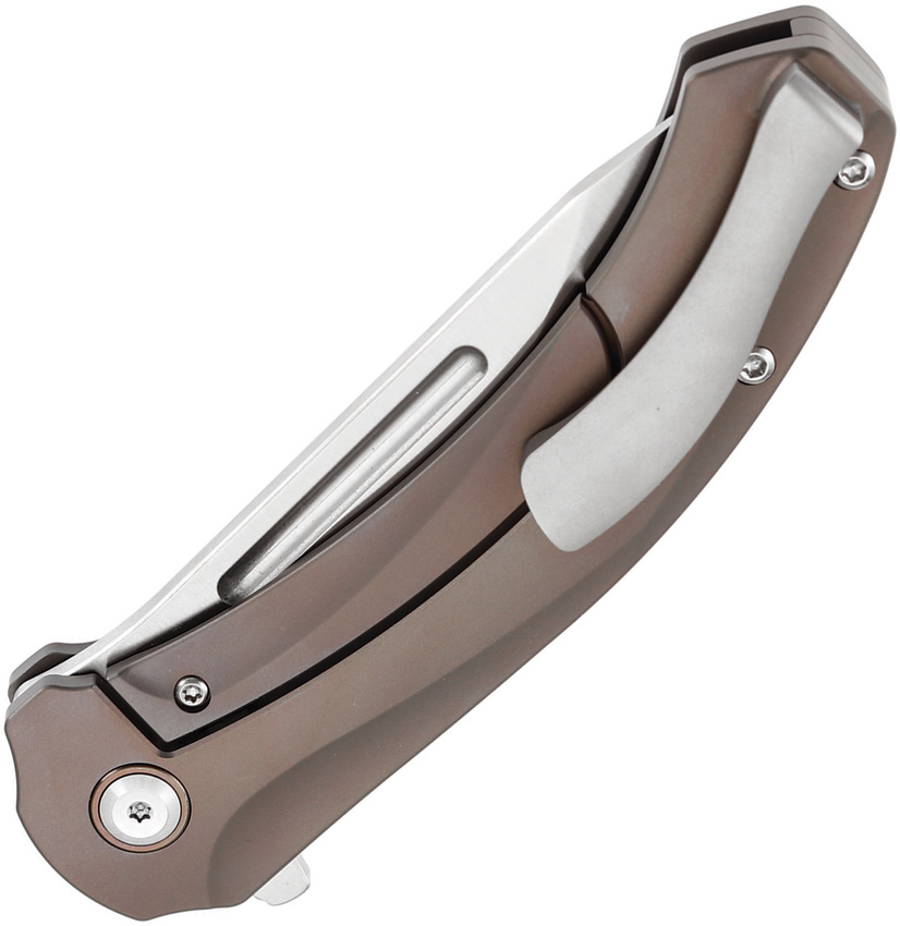 4.5″ (11.43cm) closed. 3.5″ (8.89cm) satin finish CPM S35VN stainless tanto blade. Bronze anodized titanium handle. Extended tang. Pocket clip. Boxed.