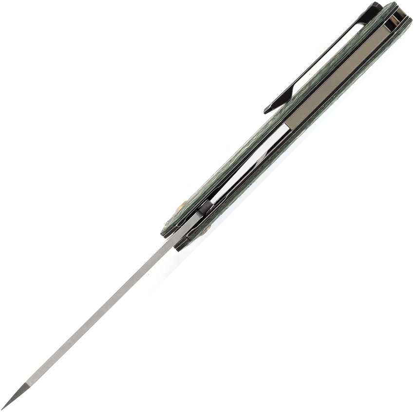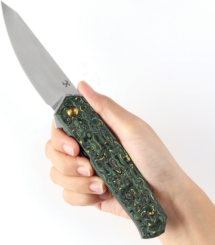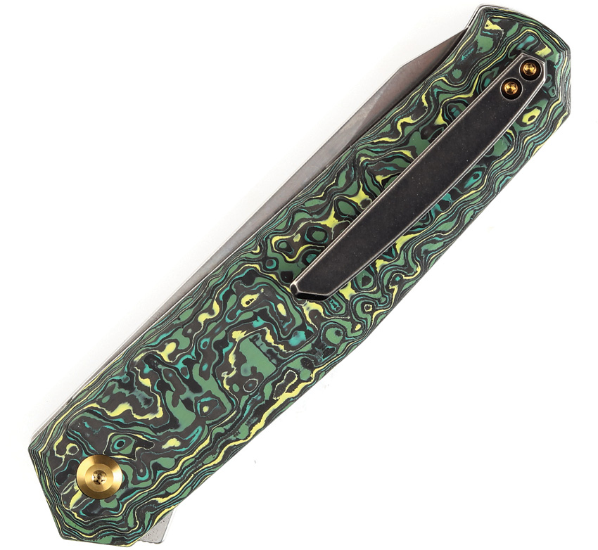 4.88″ (12.4cm) closed. 3.75″ (9.53cm) stonewash finish S35VN stainless blade. Green and yellow carbon fiber handle. Extended tang. Pocket clip. Black nylon pouch. Boxed.