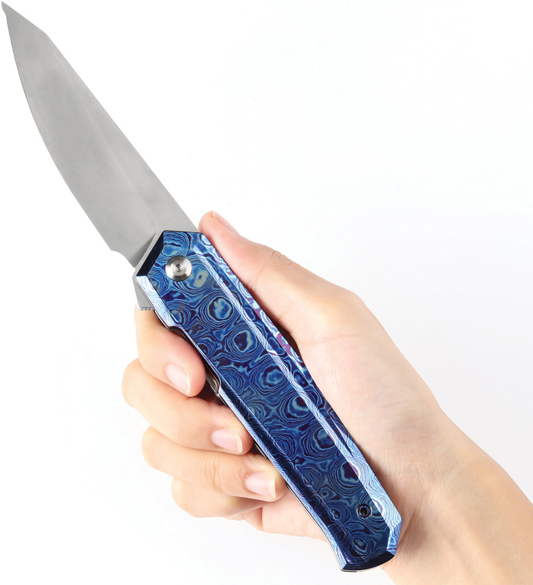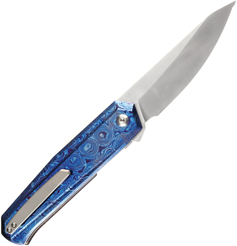 4.88″ (12.4cm) closed. 3.75″ (9.53cm) satin finish S35VN stainless blade. Timascus handle. Extended tang. Pocket clip. Black nylon pouch. Boxed.