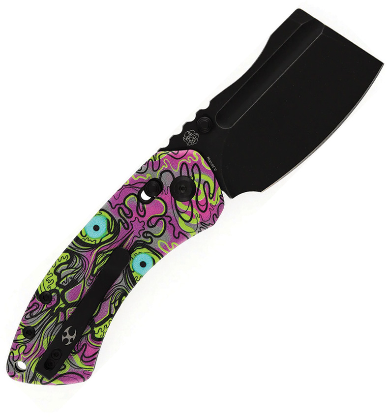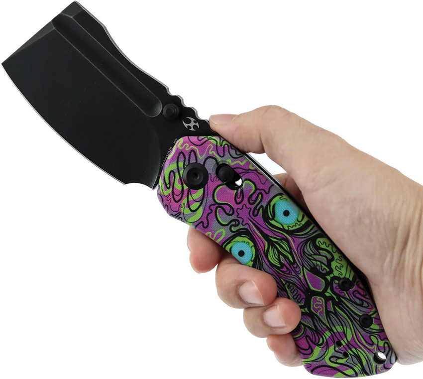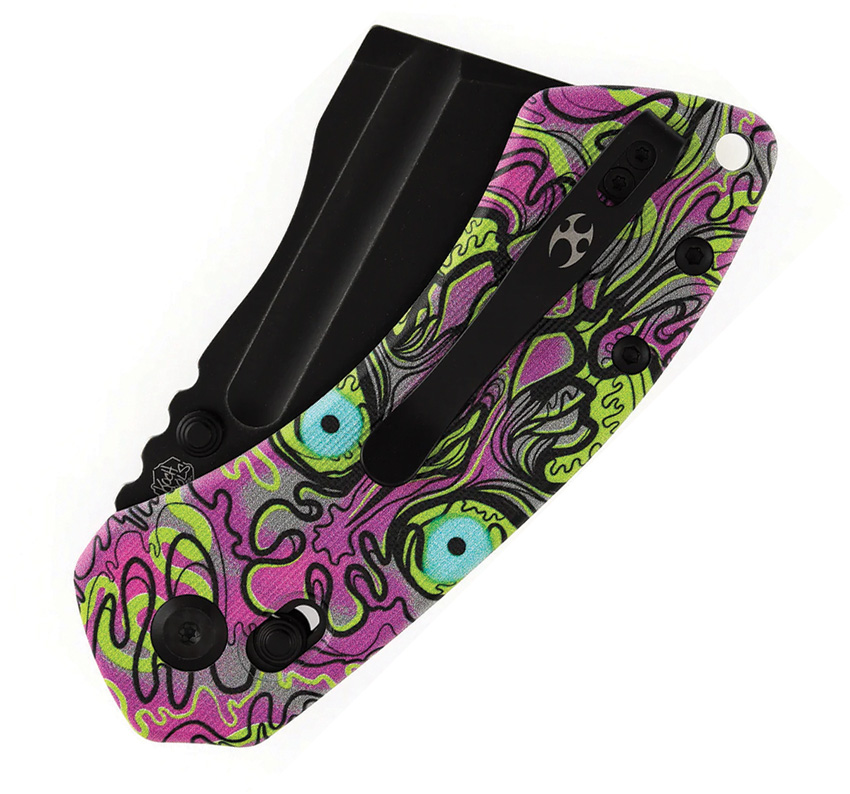 4.38″ (11.13cm) closed. 2.9″ (7.37cm) BlackWash finish D2 tool steel cleaver style blade. Jade G10 handle. Thumb stud. Lanyard hole. Pocket clip. Purple Undead print handle artwork. Boxed.