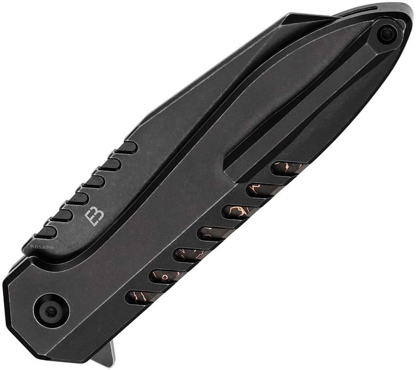 4.5″ (11.43cm) closed. 3.38″ (8.59cm) BlackWash finish 154CM stainless Wharncliffe blade. BlackWash finish titanium handle with Copper foil carbon fiber inlay. Extended tang. Pocket clip. Black nylon pouch. Boxed.