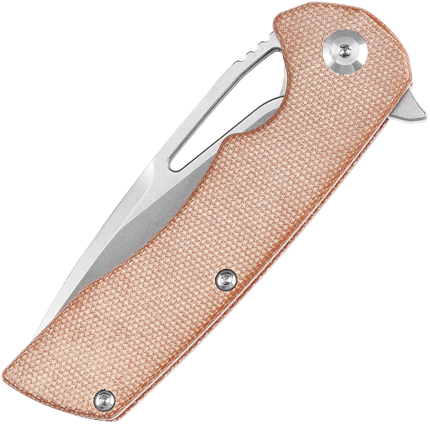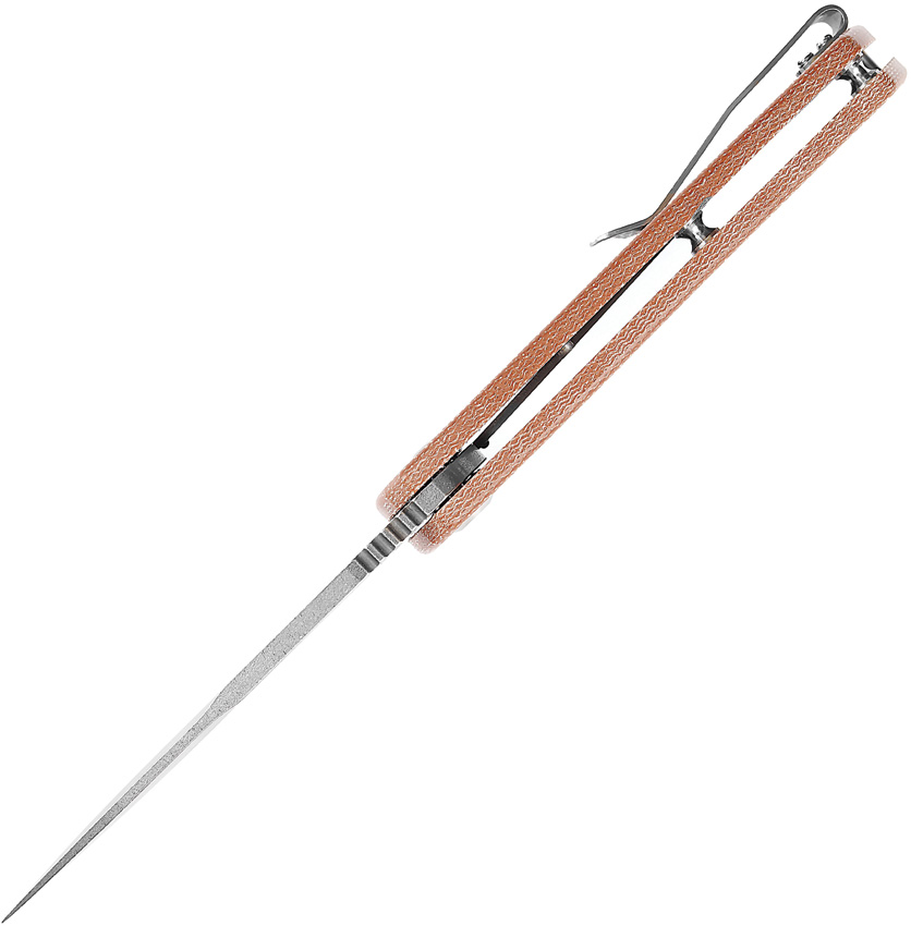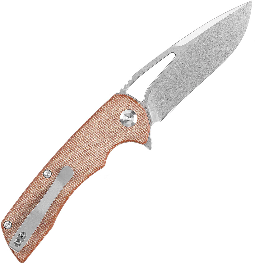 4.5″ (11.43cm) closed. 3.5″ (8.89cm) stonewash finish 12C27 Sandvik stainless blade. Brown canvas micarta handle. Extended tang. Pocket clip. Thumb pull. Black nylon pouch. Boxed.