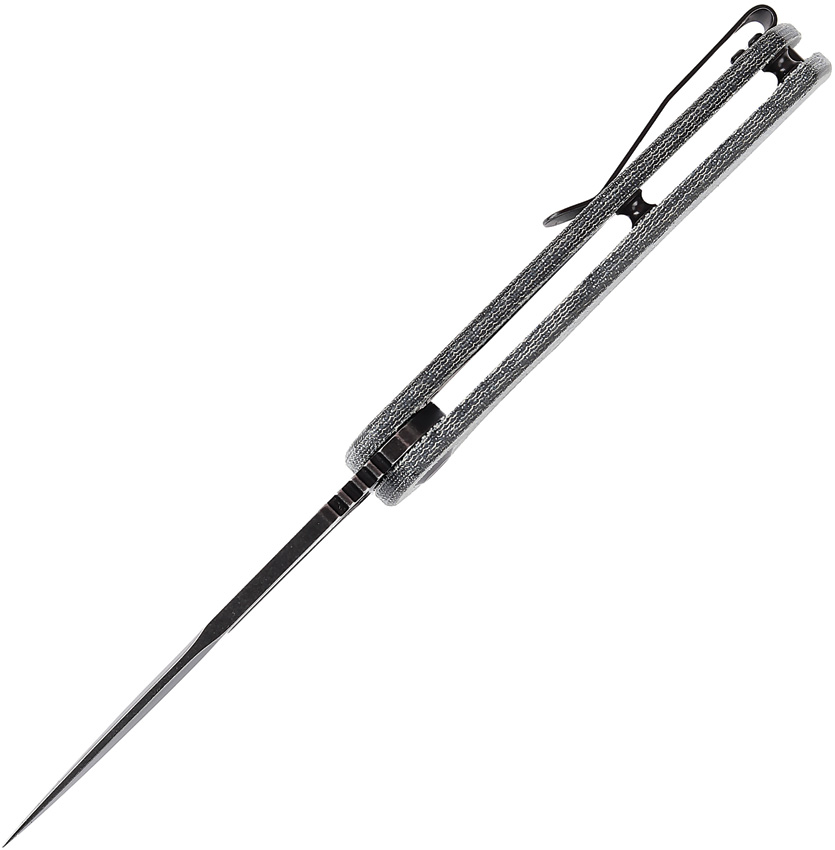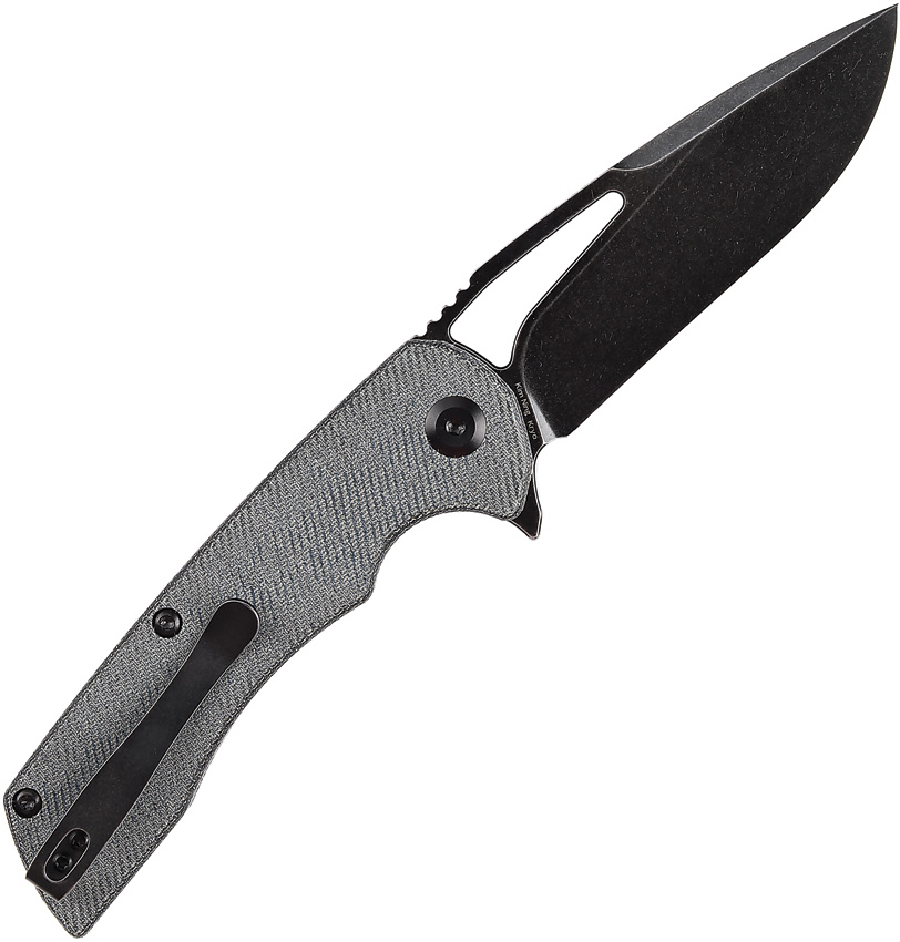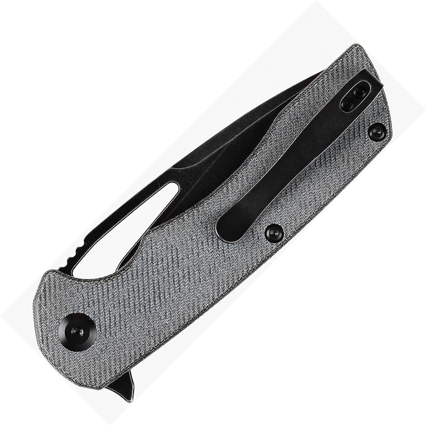 4.5″ (11.43cm) closed. 3.5″ (8.89cm) black stonewash finish 12C27 Sandvik stainless blade. Denim gray canvas micarta handle. Thumb pull. Pocket clip. Extended tang. Black nylon pouch. Boxed.