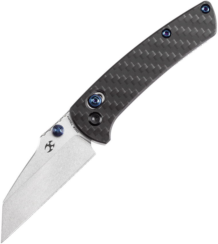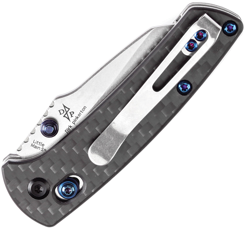 3.13″ (7.95cm) closed. 2.25″ (5.72cm) stonewash finish 154CM stainless blade. Twill carbon fiber handle. Pocket clip. Thumb stud. Black nylon pouch. Boxed.