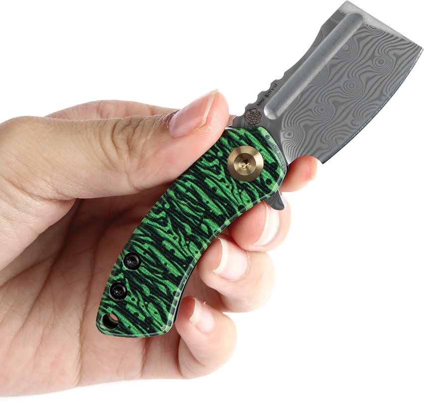 2.25″ (5.72cm) closed. 1.5″ (3.81cm) Damascus steel blade. Jade G10 handle. Extended tang. Lanyard hole. Pocket clip. Watermelon peel print handle. Black nylon pouch. Boxed.