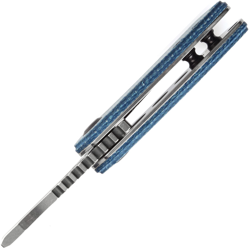 2.25″ (5.72cm) closed. 1.5″ (3.81cm) stonewash finish 154CM stainless blade. Blue canvas micarta handle. Extended tang. Lanyard hole. Pocket clip. Black nylon pouch. Boxed.