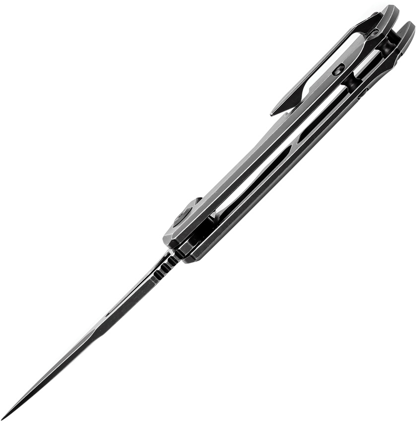 3.75″ (9.53cm) closed. 2.75″ (6.99cm) black stonewash finish CPM S35VN stainless blade. Black stonewash finish titanium handle. Extended tang. Thumb pull. Pocket clip. Black nylon pouch. Boxed.