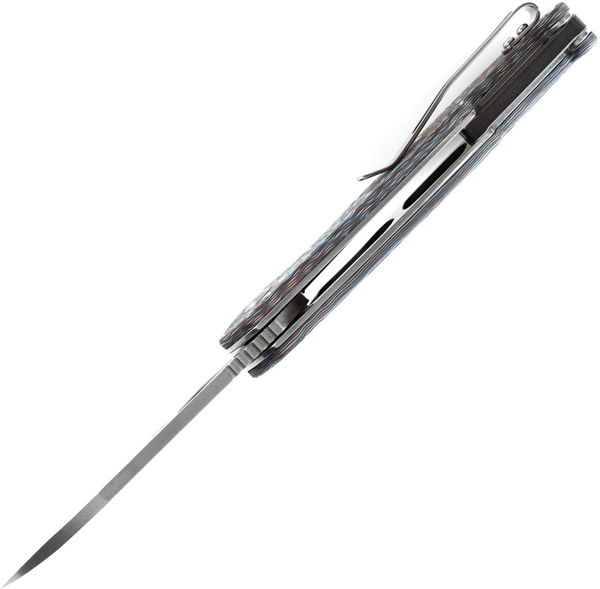 4.38″ (11.13cm) closed. 3.25″ (8.26cm) stonewash finish CPM-20CV stainless blade. Red, black, white, blue carbon fiber handle. Thumb pull. Lanyard hole. Extended tang. Pocket clip. Black nylon pouch. Boxed.