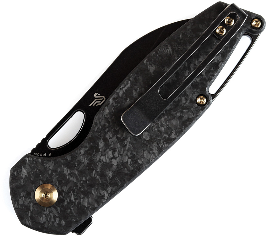 4.38″ (11.13cm) closed. 3.25″ (8.26cm) black stonewash finish CPM-20CV stainless blade. Shredded carbon fiber handle. Thumb pull. Extended tang. Lanyard hole. Pocket clip. Black nylon pouch. Boxed.