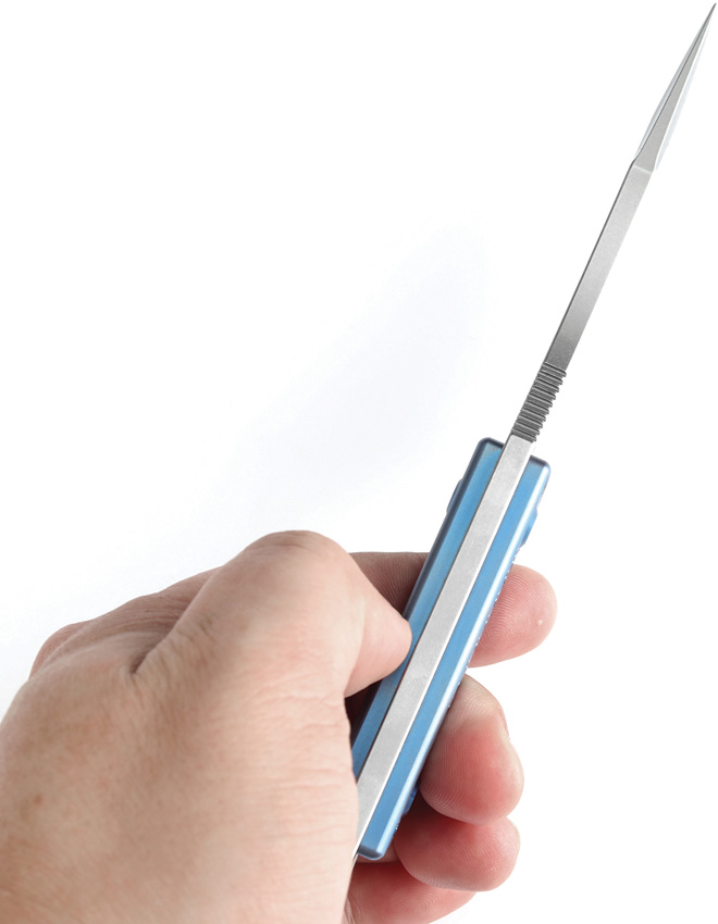 7.25″ (18.42cm) overall. 3.5″ (8.89cm) stonewash finish D2 tool steel clip point blade. Blue anodized titanium handle. Full, extended tang. Finger ring. Frag pattern handle. Black Kydex belt sheath. Boxed.