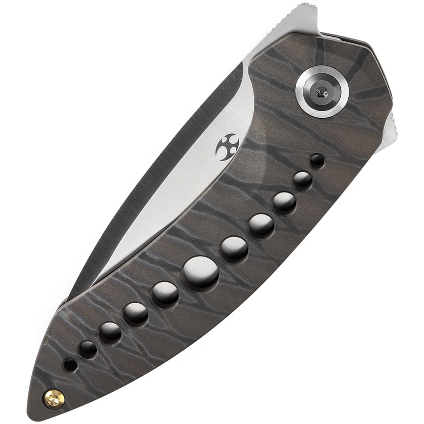 4.25″ (10.8cm) closed. 3.13″ (7.95cm) satin finish CPM-20CV stainless drop point blade. Flame anodized titanium handle. Extended tang. Pocket clip. Black nylon pouch. Boxed.
