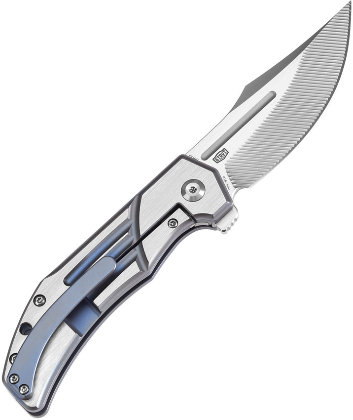 4.13″ (10.49cm) closed. 3.13″ (7.95cm) satin finish CPM S35VN stainless clip point blade. Blue and satin finish anodized titanium handle. Thumb disk. Extended tang. Lanyard hole. Pocket clip. CNC textured blade. Black nylon pouch. Boxed.
