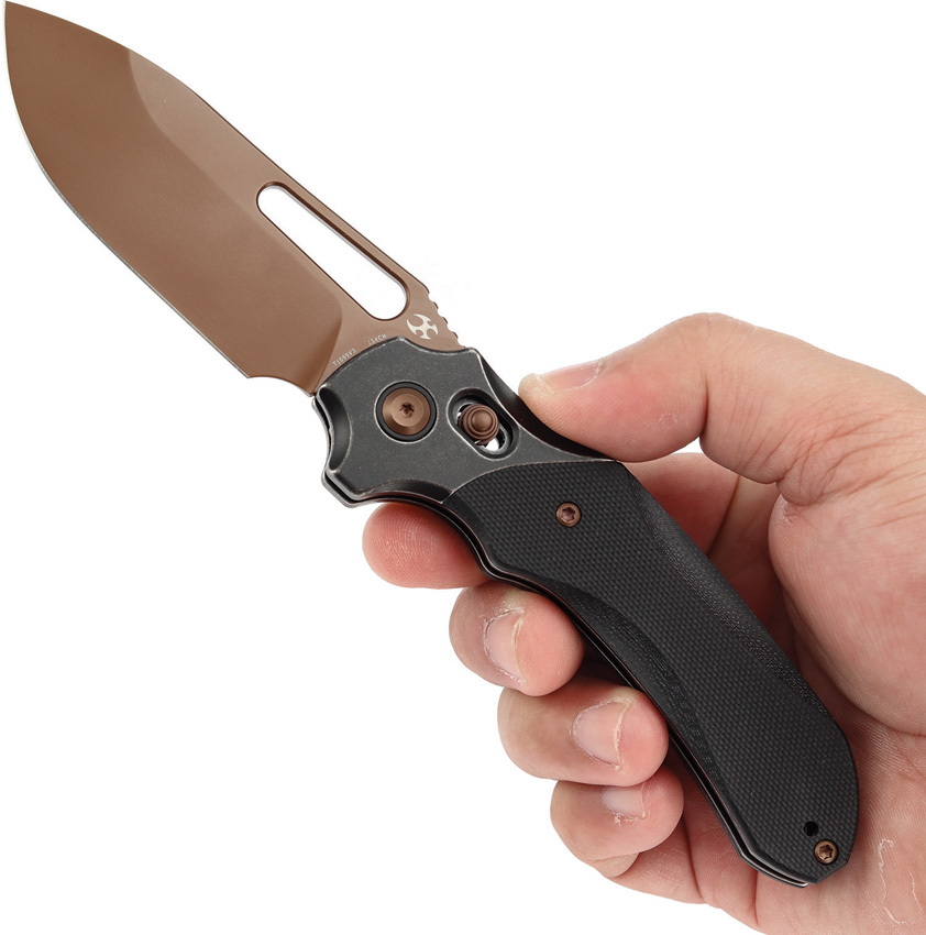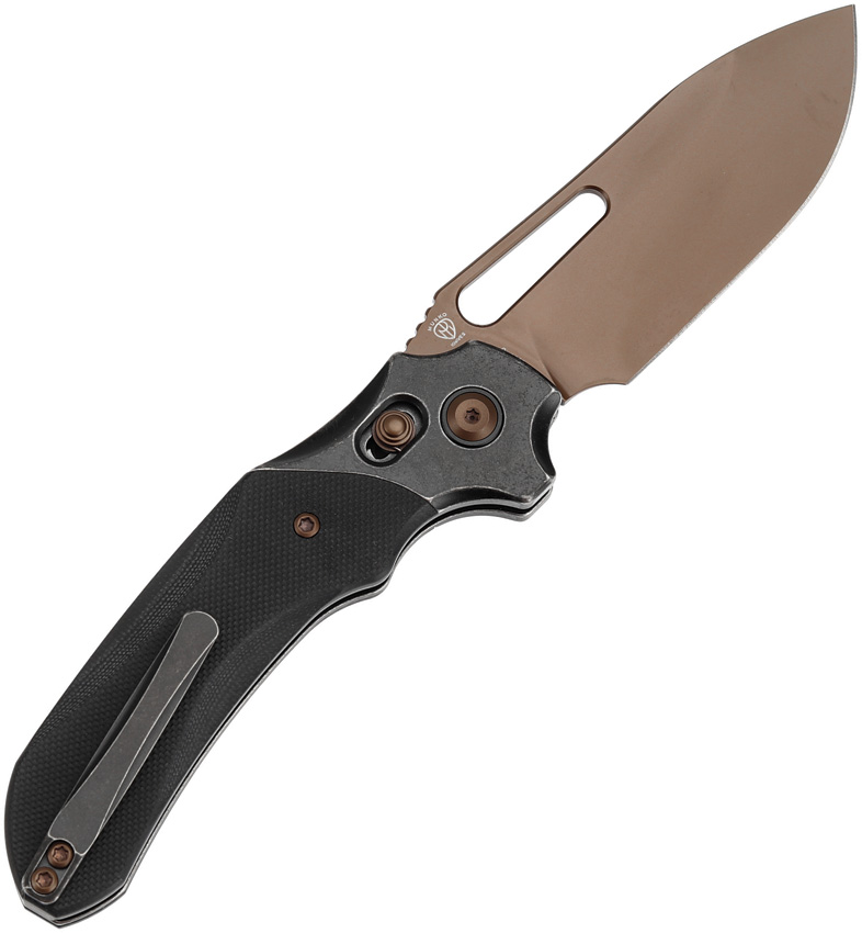 4.63″ (11.76cm) closed. 3.38″ (8.59cm) rose finish 154CM stainless drop point blade. Black G10 handle. Stainless bolster(s). Thumb pull. Pocket clip. Black nylon zippered storage case. Boxed.