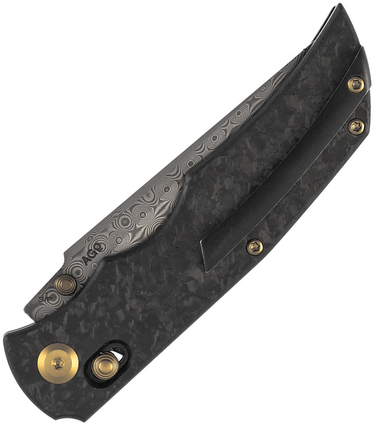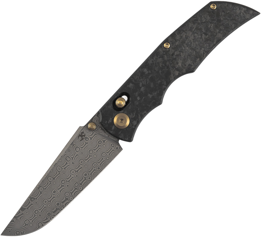 4.88″ (12.4cm) closed. 3.75″ (9.53cm) Damascus steel drop point blade. Shredded carbon fiber handle. Thumb stud. Pocket clip. Black nylon pouch. Boxed.